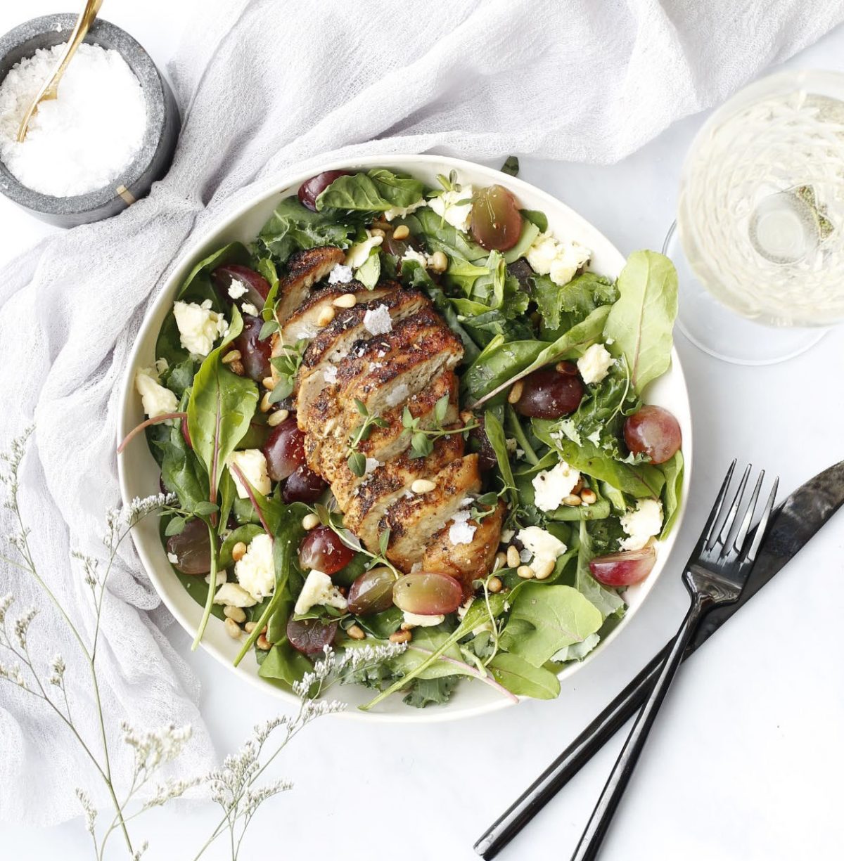 Salat með grilluðum kjúkling og hvítvín Uppskrift: Linda Ben Hráefni: 3 kjúklingabringur Bragðmikil kjúklingakryddblanda 250 g Salatblanda með rucola og spínati 2 dl rauð vínber ½ feta ost kubbur ½ dl ristaðar furuhnetur 1 dl extra virgin ólífu olía 3 msk balsamik edik 1 msk ferskt timjan