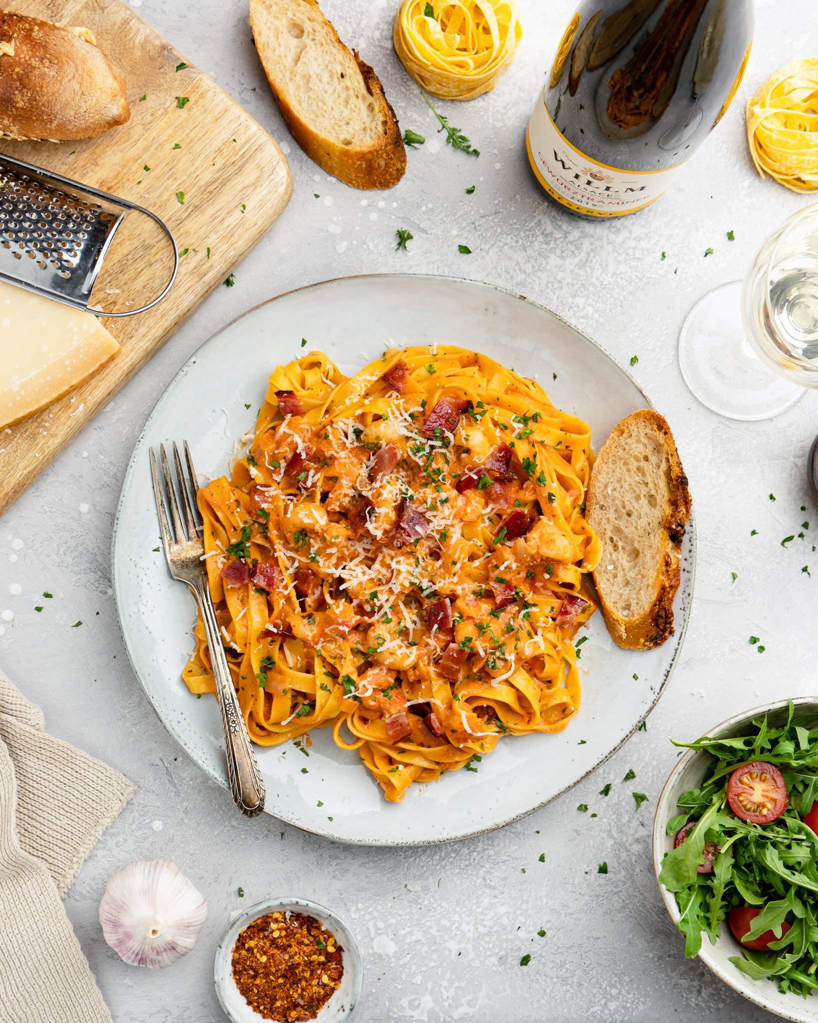 Risarækju alfredo með beikoni og ristuðum panko raspi Hráefni Risarækjur, 400 g Beikon,
