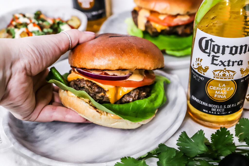 Steikið hamborgarana á heitri pönnu eða grillið þar til þeir eru eldaðir í gegn.