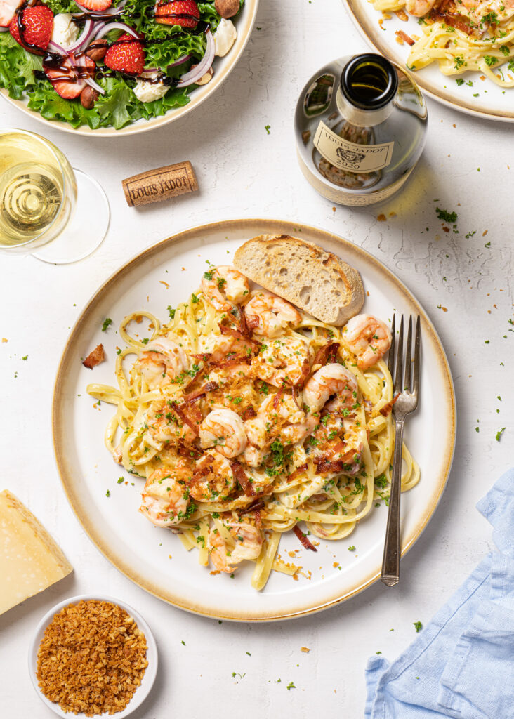 Risarækju alfredo með beikoni og ristuðum panko raspi