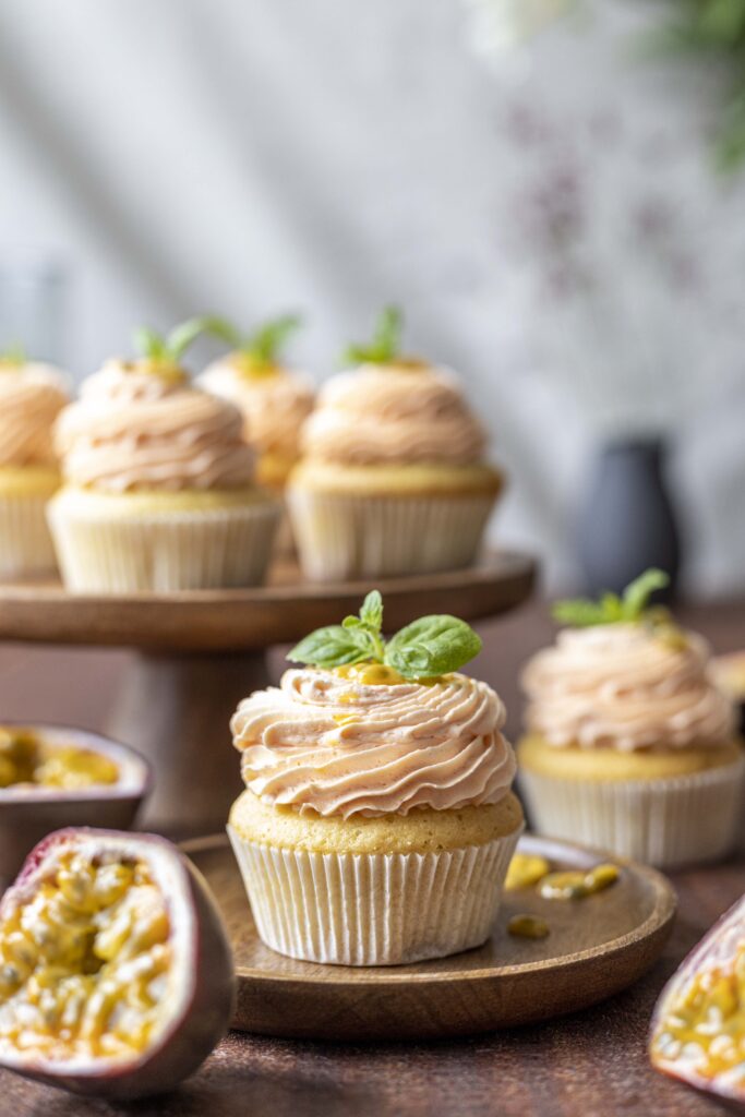 Setjið stóran hringlaga stút ofan í sprautupoka og fyllið pokann af kremi, sprautið á kökurnar þegar þær hafa náð stofuhita og skreytið með ferskum ástríðuávexti og mintu.